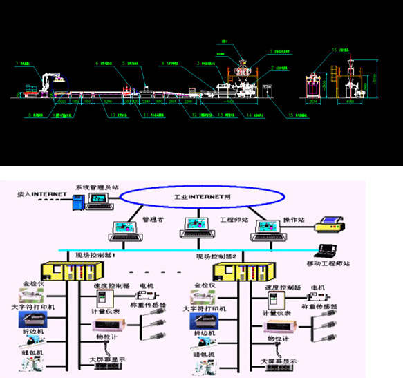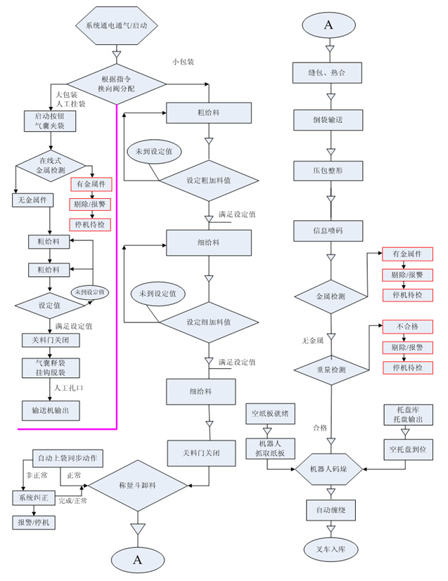 該系統(tǒng)包含了小袋包裝的自動上袋、稱重、輸送、封口、倒袋、噴碼、金屬檢測、重量檢測、碼垛,大袋稱重包裝及其集散控制系統(tǒng)、信息管理系統(tǒng)。