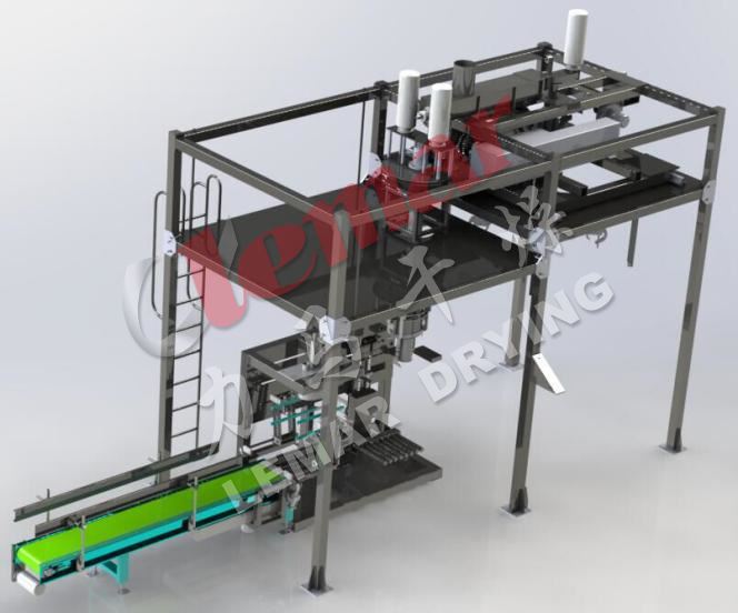 系統由雙向分料螺旋通過變頻控制為為大、小包裝供料。大包裝采用垂直加料螺旋喂料,集成高低速加料、電動升降、抖包、空袋吹氣、全密封夾袋器等裝置,有效解決包裝速度及精度要求,緩釋技術防止落袋揚塵;小包裝包含分散破拱料斗、加料集成裝置、垂直喂料機構、升降夾袋裝置、浮動關料閥門、稱重裝置及電氣控制系統。保證其包裝速度和精度,改善稱重包裝時的粉塵污染問題。配套拖袋牽引脫氣系統、縫包貼邊熱合機在稱重加料完畢后實現滿袋的自動牽引并抽氣,熱合封口。金檢機、重檢機對已封口的滿袋物料進行金屬檢測和重量檢測。